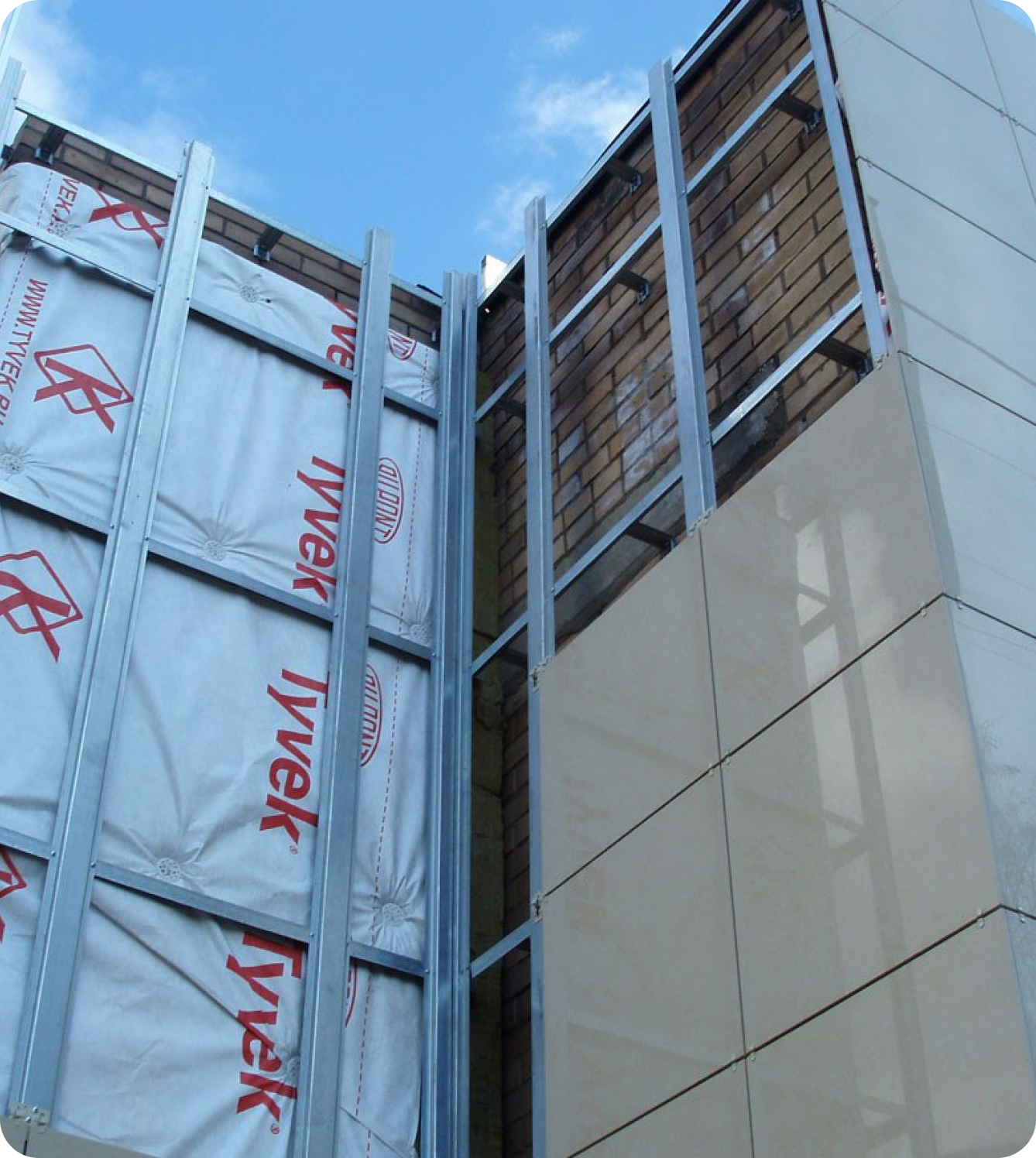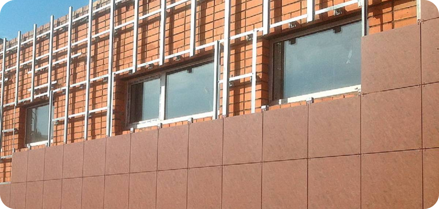 это современная навесная система облицовки зданий. Конструкция состоит из облицовочных панелей (керамогранит, фиброцемент, металлокассеты и др.), которые крепятся на алюминиевый или стальной каркас.